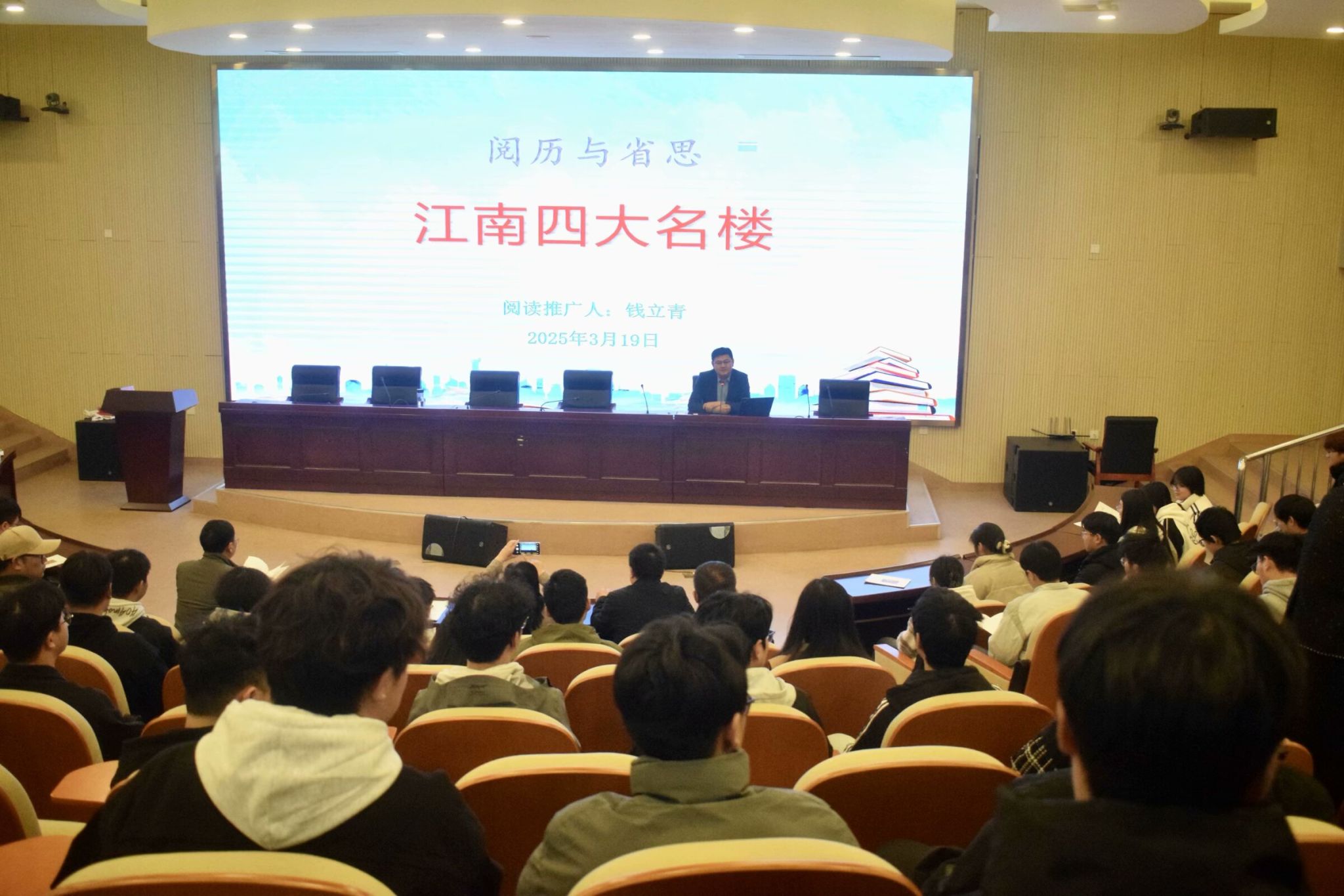 3月19日,“阅+历”读书讲堂“名家导读”系列讲座在滨湖校区多功能报告厅举办,江淮文化名家、安徽省十佳阅读推广人,教务处处长钱立青教授为同学们作了题为“阅历与省思:江南四大名楼”的讲座。永利集团304am登录学生代表150余人参加。滨湖校区综合管理办公室主任周荣,图书馆馆长方孝玲,美术与设计学院副院长吴道义,永利集团304am登录党委副书记杨萍出席。讲座由永利集团304am登录党委书记王祥主持。