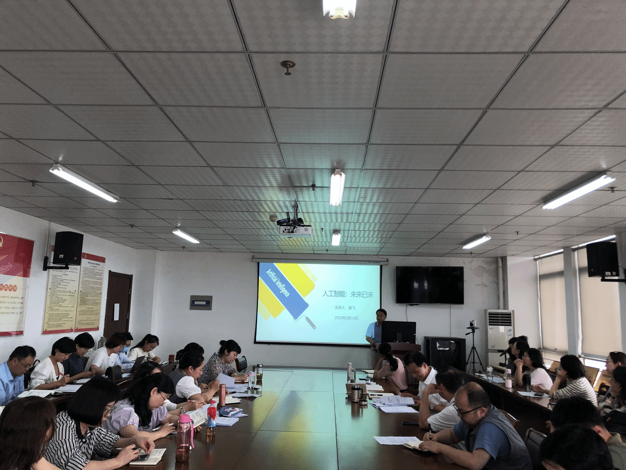 院长谢飞以“人工智能 未来已来”为主题作学术报告。报告从人工智能诞生和发展现状入手,深入剖析了人工智能在教育教学过程中的应用场景,如个性化学习推荐系统、智能教学辅助工具、自动化教学评估等。与会老师围绕“人工智能+教育”的课程设计与开发、教学方法创新、师资队伍建设等主题展开了热烈讨论。